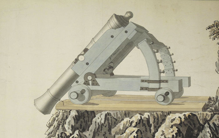 Fig.19. Courtesy Gibraltar Museum. Koehler depressing carriage as drawn by Lieutenant Koehler, 1782 . Courtesy Royal Artillery Historical Trust.